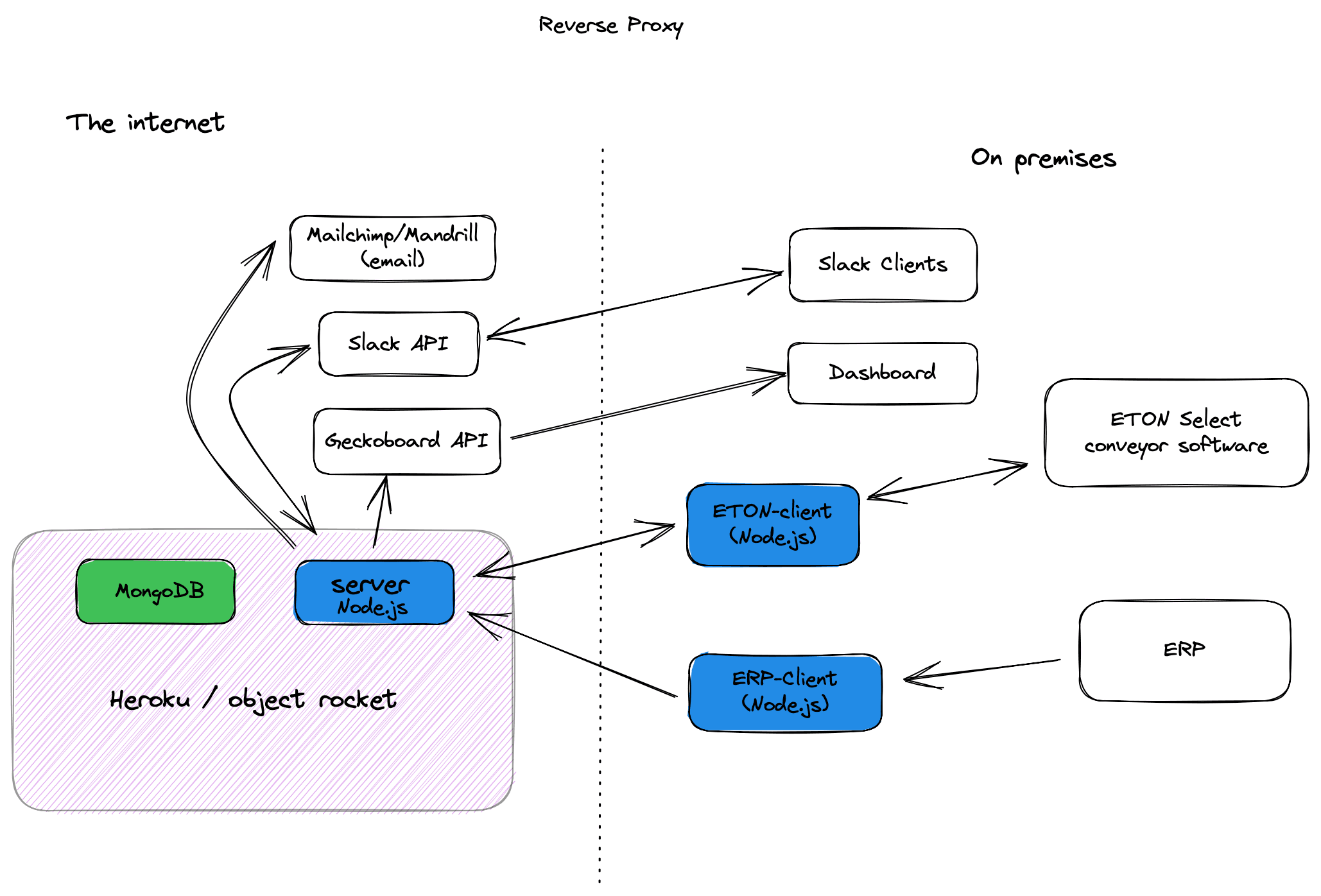 After visiting other installations & finalizing the scope of work, I had to write the middleware for the two systems. To avoid general hardware and network issues, I decided to deploy most of the service on the internet; I had no experience doing this and took a chance using Heroku. I felt it would be more accessible than configuring a hosted Docker or EC2 instance on AWS.